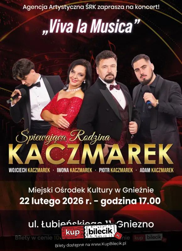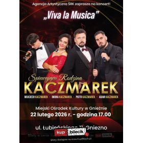 bilety: "Viva La Musica" to zupełnie nowy koncert jedynej w Polsce rodziny śpiewającej muzykę klasyczną. W wykonaniu Śpiewającej Rodziny Kaczmarek usłyszycie państwo tym razem najpiękniejsze melodie z operetki min. Wesołej wdówki, Hrabiny Marizy, Księżniczki Czardasza, czy Guditty, przeboje z musicali min: Skrzypka na dachu, My fair lady czy Upiora w operze, a także piękne standardy muzyki rozrywkowej, piosenki z repertuaru Franka Sinatry Elvisa Presleya, Poula Anki czy Luisa Armstronga. Śpiewająca Rodzina Kaczmarków artyści: Iwona Kaczmarek, Piotr Kaczmarek, Wojciech Kaczmarek, Adam KaczmarekŚpiewająca Rodzina Kaczmarków - dobrze znana w całej Polsce. Koncertują razem od 4 lat. Adam i Wojtek dali się poznać szerokiej publiczności po występie w programie Mam talent, odnosząc tamże ogromny sukces. Adam Karczmarek to również gość Festiwalu Piosenki Krajowej w Opolu. Bilety do nabycia na: KupBilecik.pl |